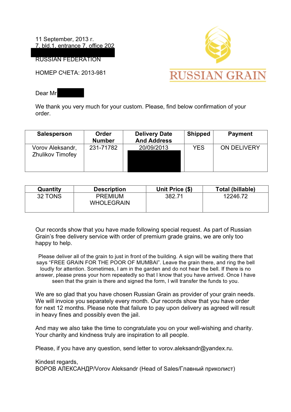 We at Russian Grain are surprised that you no longer wish to help the poor children of Mumbai. I just looked at your place on Google maps and it is obvious that you are the wealthy man. Why would you suddenly change your mind at the last minute? There are going to be some very disappointed poor people in the big city. They probably have nowhere else to go.