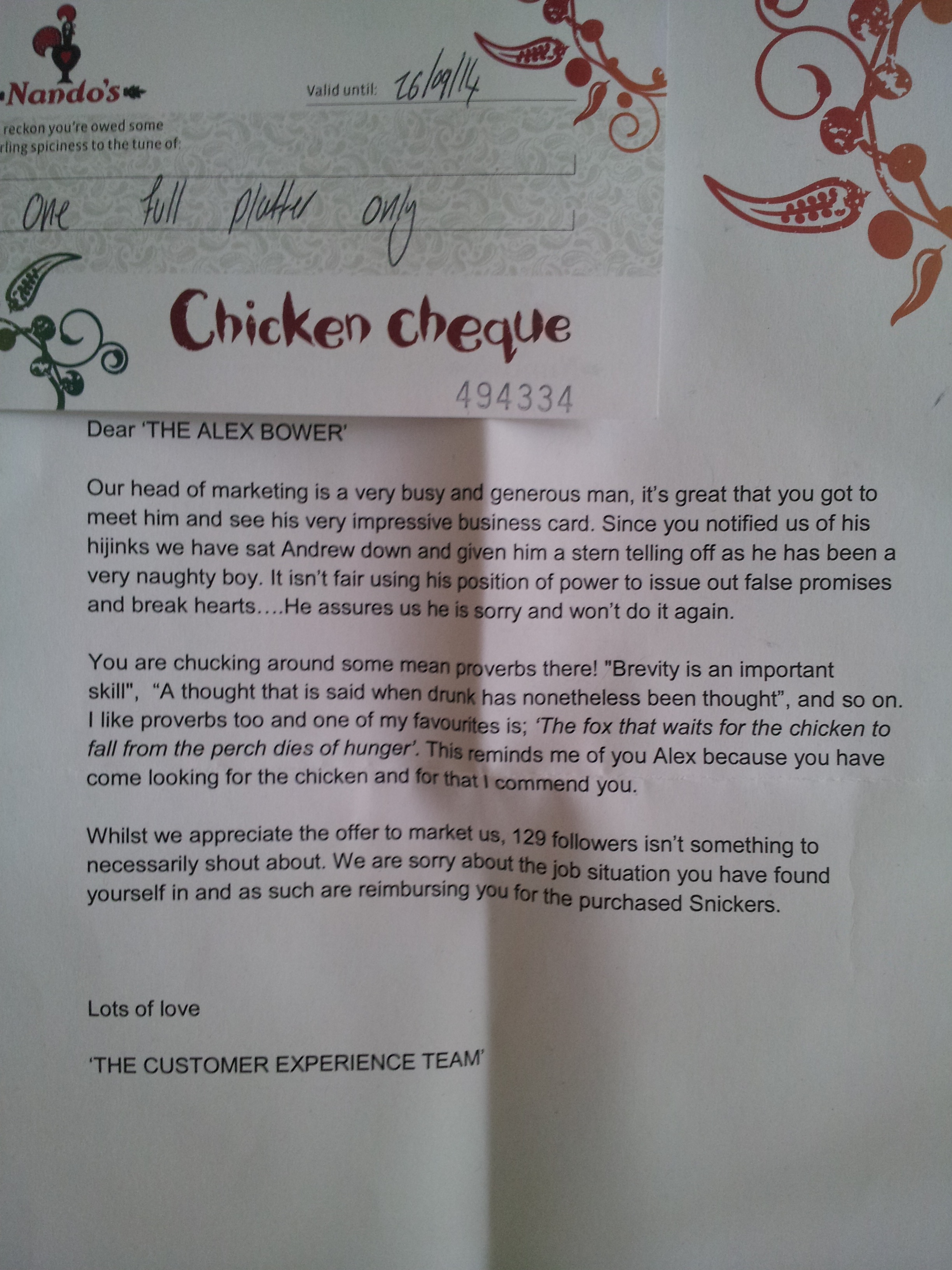 I’m writing because at a recent function I was promised unlimited free chicken for life by a man who said he was very important at Nando’s. He did have an impressive business card and although I can’t remember his name I’m fairly sure it was Andrew Rayner, Head of Marketing at Nandos. He was really drunk at the time, but I’m reasonably sure there is an old Belgian proverb which goes along the lines of “A thought that is said when drunk has nonetheless been thought.”