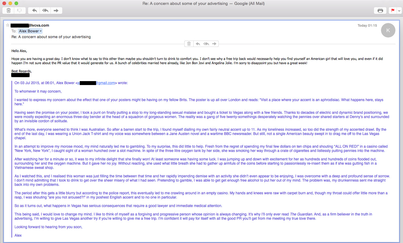 I passed through there for three days a few years ago on my way out of LA and I was immediately struck by the wafer-thin, extremely shiny veneer that papers over the palpable undercurrent of desperation. The strip is not a place of poverty, extreme crime or real danger. But it is the home of a disconcerting sense of emptiness. Inside casinos are rows of silent pensioners slotting their way through their final years to the saccharine muzak of the shop floor; on the streets, a younger crowd of bros searching for fulfilment with the hollow affections of a lap dance.